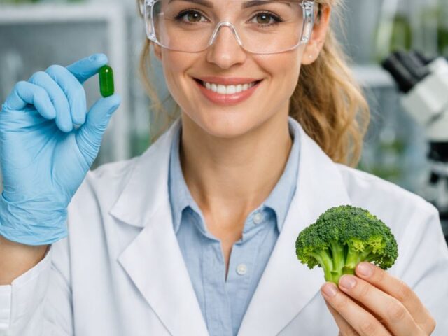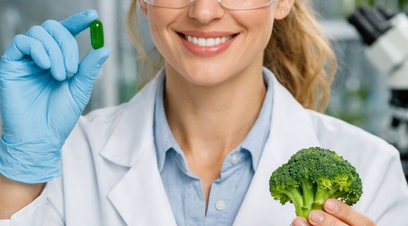 Uma cápsula que revela o poder do nutracêutico: a união entre ciência e natureza. A imagem simboliza como ingredientes naturais — frutas, vegetais e ativos essenciais — se transformam em soluções concentradas para cuidar do corpo de dentro para fora, promovendo equilíbrio, saúde e bem-estar de forma inteligente e consciente.